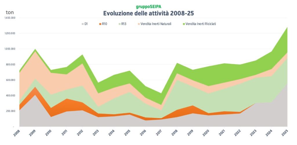 È su questa direttrice che si colloca l’evoluzione industriale del Gruppo Seipa, che nel 2025 ha superato stabilmente la soglia di 1,2 milioni di tonnellate di materiali gestiti tra ingressi e uscite dai propri insediamenti produttivi.