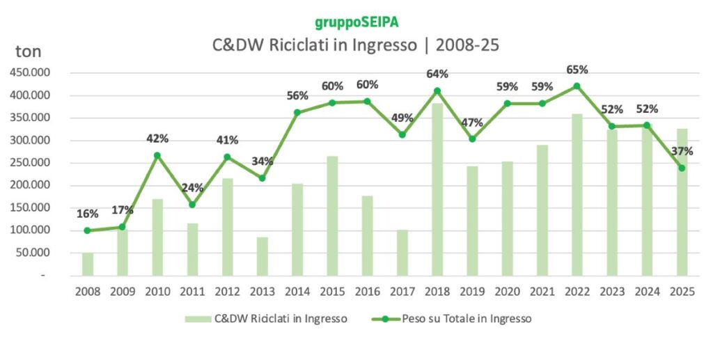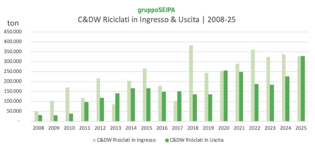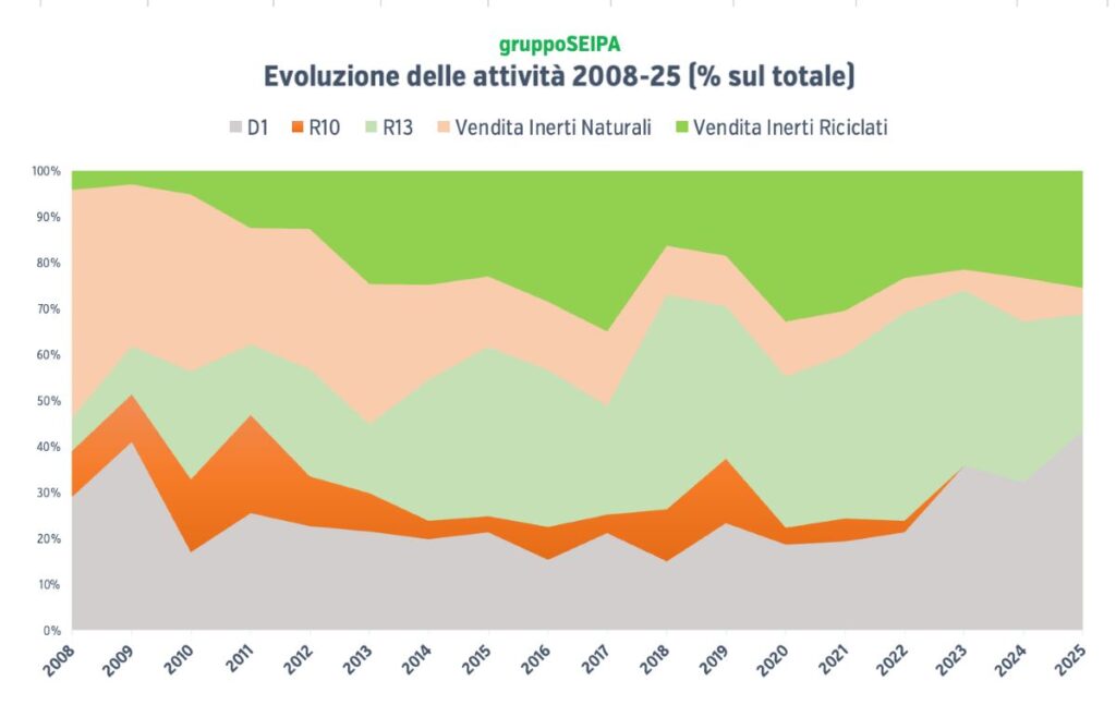 Dal 2008 al 2025 la produzione di aggregati inerti riciclati nell’ambito Gruppo Seipa cresce di 10 volte. Il 75% dei materiali in uscita è oggi di natura riciclata.
