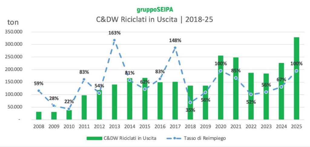 Nel 2025 la produzione di aggregati riciclati da rifiuti da costruzione e demolizione (C&DW) ha superato le 320 mila tonnellate, segnando un livello di scala industriale significativamente superiore rispetto alle prime sperimentazioni del percorso circolare avviato nel 2008.