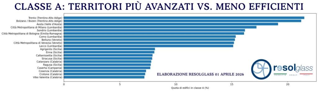 È quanto emerge dall’elaborazione Resolglass (aprile 2026) su base SIAPE/ENEA ed elaborazioni proprietarie su scala provinciale, che per la prima volta ricostruisce —secondo un modello probabilistico coerente— la distribuzione degli edifici per classi energetiche per ciascuna provincia e città metropolitana italiana (qui il dataset completo).